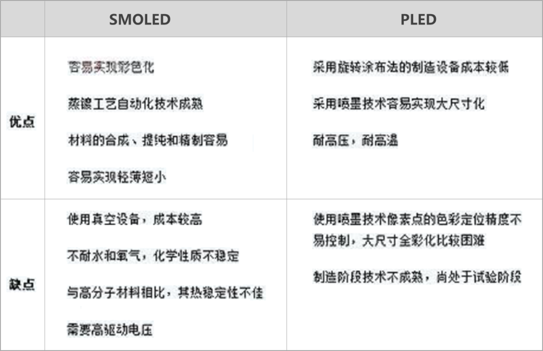 按发光材料分类,OLED可分为小分子OLED((或称为SMOLED)和高分子OLED((或称为PLED)。小分 子OLED主要采用的是真空热蒸镀工艺,主要适用于中小型尺寸显示器;而高分子OLED采用的是 旋转涂覆或者是喷涂印刷工艺,以大尺寸显示器为应用目标。小分子OLED的基本专利由美国 Kodak公司拥有,高分子OLED的专利由英国的CDT和美国的Uniax公司拥有。
