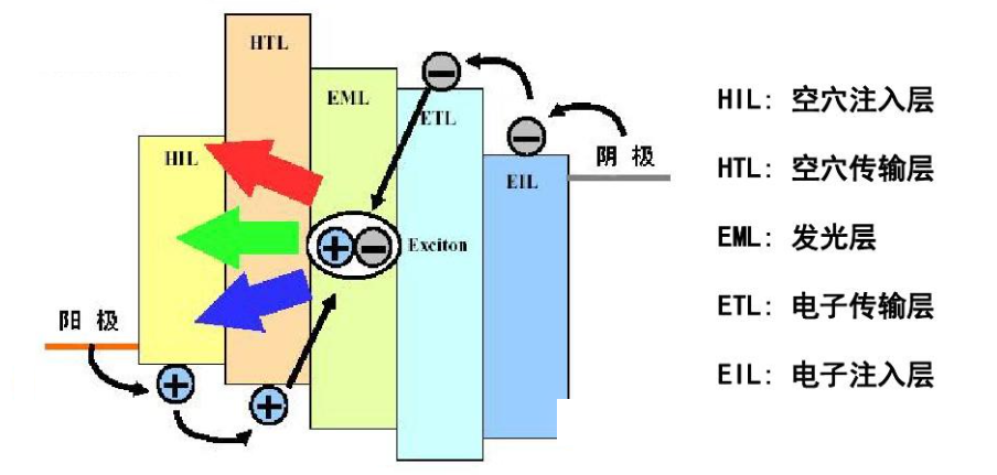 OLED核心原理是利用有机材料在电场的作用下产生发光现象。具体来说,当电流通过特定有机材 料薄膜时,电子和空穴分别从阴极和阳极注入到有机发光层,并在有机发光层中相遇,形成激子 ((电子空穴对),激子辐射退激后发出光子,最终产生可见光。